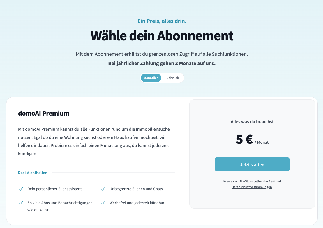 Um einen neuen domoAI Account zu erstellen, klicke auf den "Jetzt starten"-Button auf der Startseite. Du hast bereits einen Account? Kein Problem - Zum Login.